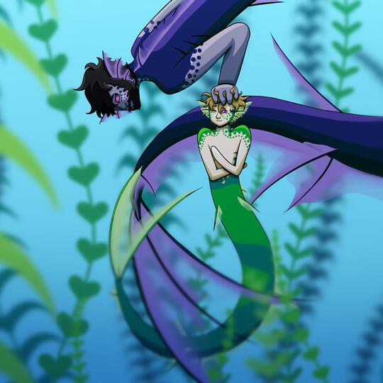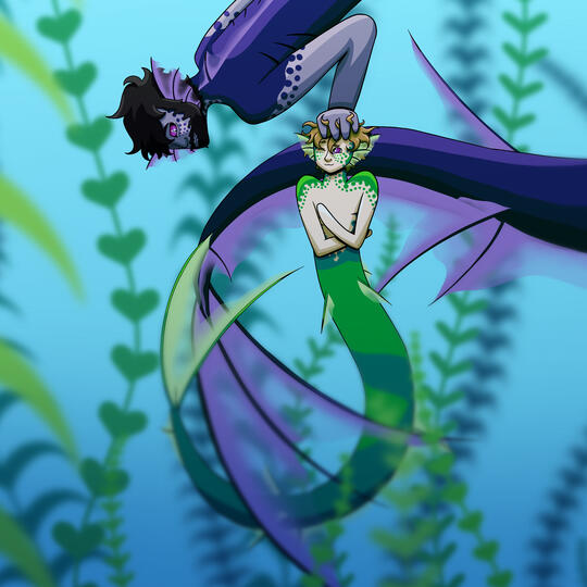 A young adult merman who lives in a kelp forest with his parents and two older siblings. He’s curious about the world around him, but an experience from his childhood makes him too afraid to explore. Plus, his parents don’t want him wondering off too much. Especially now that that human has been coming way too close to their home for comfort.Bo doesn’t think the human looks that scary or dangerous, he’d like to say hi. But he knows his family would be furious, especially his dad.